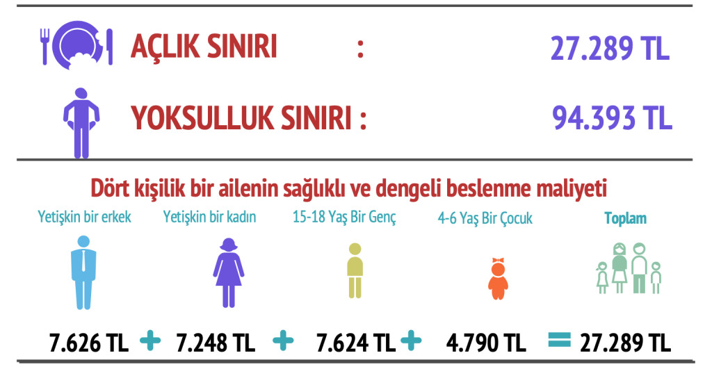 Bu harcama tutarı sadece gıda için yapılması gereken minimum tutarı ifade ediyor. Raporda, gıda harcamasının yanı sıra eğitim, sağlık, barınma, eğlence, ısınma ve ulaşım gibi yaşamsal giderlerin de dahil edildiği yoksulluk sınırının ise 94 bin 393 TL olarak gerçekleştiği belirtildi.