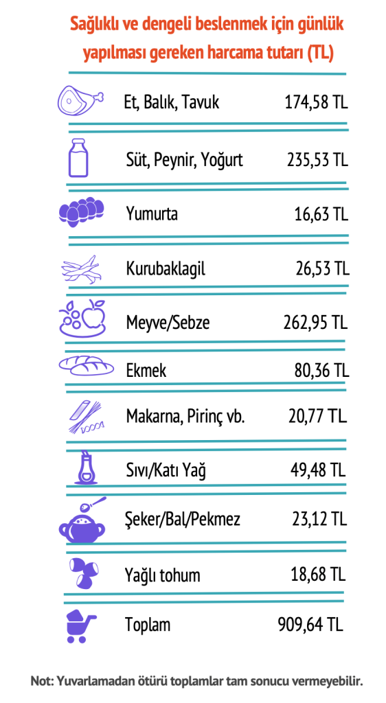 Bu grubu 227 TL ile et, yumurta ve baklagiller, 198 TL ile sebze ve meyve, 124 TL ile ekmek ve makarna ürünleri takip ediyor. Diğer gıda kalemleri için ise günlük 51 TL harcanması gerektiği belirtiliyor.