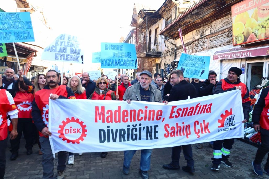 Sivas’ın Divriği ilçesinde maden sahalarının kapanmasına ve işten çıkarılmalarına karşı 18 gündür direnen DİSK/Dev Maden-Sen üyesi işçiler, Erdemir’e bağlı taşeron Çiftay Madencilik ve OYAK Maden’e karşı Cumhuriyet Meydanı’na yürüdü.