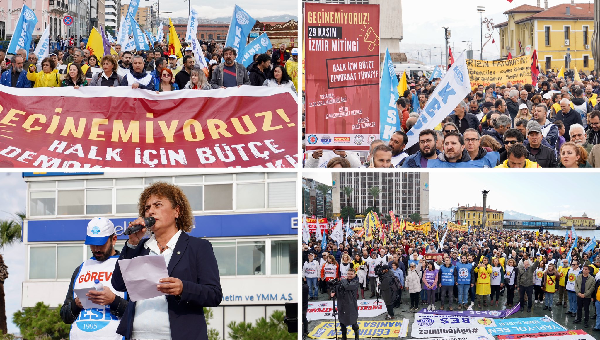 Kamu Emekçileri Sendikaları Konfederasyonu’nun (KESK) çağrısıyla İzmir’de “Geçinemiyoruz” mitingi düzenlendi. Mitinge Türk-İş, TMMOB, İzmir Barosu ve İzmir Tabip Odasının yanı sıra sendikal hakları için direnen Digel Tekstil işçileri, grevdeki Temel Conta işçileri, emekli örgütleri, sol partiler, devrimci örgütler ve 10 Ekim Barış Derneği katıldı.