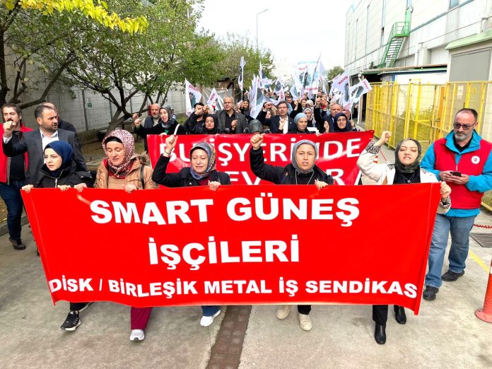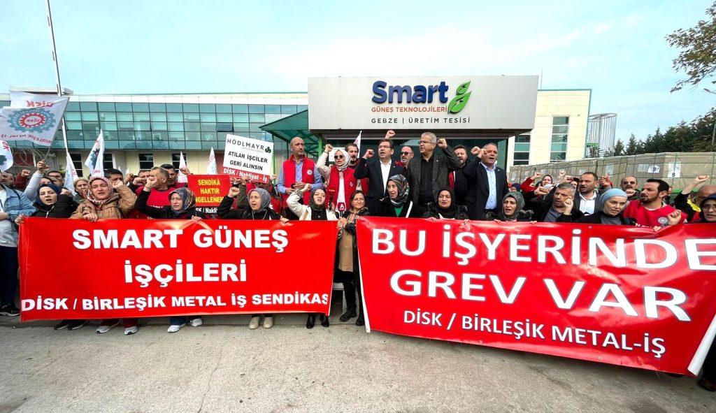 DİSK’e bağlı Birleşik Metal-İş Sendikası’nın örgütlü olduğu Smart Solar’da, aylardır süren Toplu İş Sözleşmesi (TİS) görüşmeleri, patronun ilk 6’ıncı ay için yüzde 6 gibi bir ücret artışında diretmesi üzerine anlaşmazlıkla sonuçlandı. Bunun üzerine grev kararı alındı. Karar duyurusunu 8 Ekim’de fabrika girişine asan işçiler, 22 Ekim’de (bugün) grevi uygulamaya koydu.