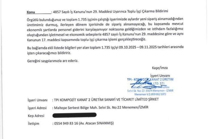 Bugün TPI Compozit Kanat San. Tic. Aş. Kaşe ve imzası ile temsilcilere ulaştırılan yazıda, 4857 sayılı iş kanununun 29. maddesi uyarınca ve aynı kanununun 17. maddesi kapsamında toplu işten çıkarma yapıldığı bildirildi.